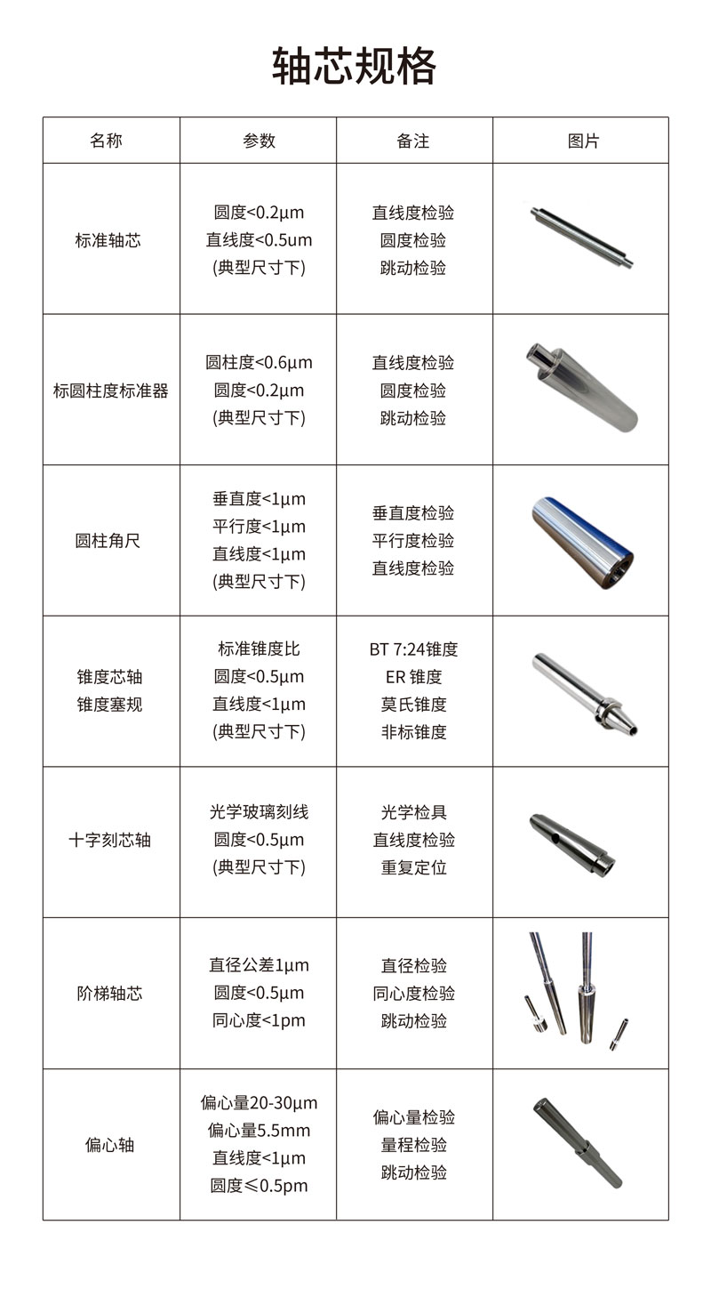 標準芯軸、偏心軸、階梯芯軸、錐度芯軸、錐度塞規、十字刻線芯軸、圓柱角尺、圓柱度標準器