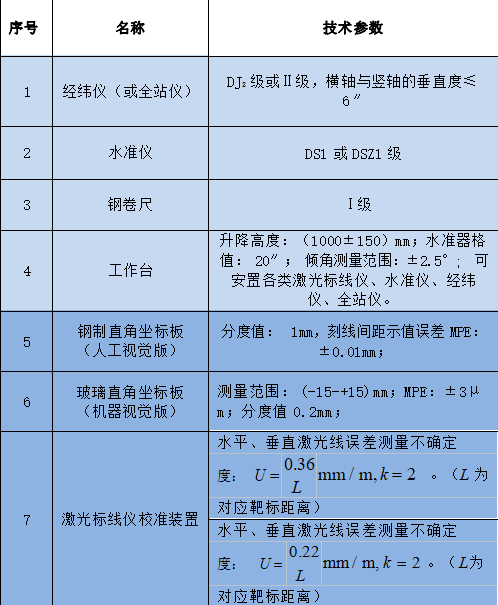 激光標線儀校準裝置主要技術參數如表 1 所示,校準方式分為機器視覺和人工視覺兩種方法,表格中淺藍色部分為兩種校準方式共用的儀器和技術參數。