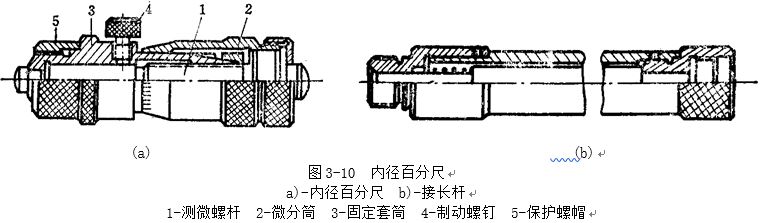 內徑百分尺如圖3-10a所示,其讀數方法與外徑百分尺相同。內徑百分尺主要用于測量大孔徑,為適應不同孔徑尺寸的測量,可以接上接長桿(如圖3-10b)。連接時,只須將保護帽5旋去,將接長桿的右端(具有內螺紋)旋在百分尺的左端即可。接長桿可以一個接一個地連接起來,測量范圍最大可達到5000mm。內徑百分尺與接長桿是成套供應的。目前,國產內徑百分尺的測量范圍(mm)