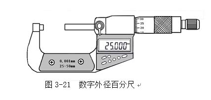 近來(lái),我國(guó)有數(shù)字外徑百分尺(圖3-21),用數(shù)字表示讀數(shù),使用更為方便。還有在固定套筒上刻有游標(biāo),利用游標(biāo)可讀出0.002或0.001mm的讀數(shù)值。
