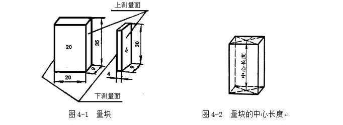 長度量塊是用耐磨性好,硬度高而不易變形的軸承鋼制成矩形截面的長方塊,如圖4-1所示。它有上、下兩個測量面和四個非測量面。兩個測量面是經過精密研磨和拋光加工的很平、很光的平行平面。量塊的矩形截面尺寸是:基本尺寸0.5~10mm的量塊,其截面尺寸為30mm×9mm;基本尺寸大于10至1000mm,其截面尺寸為35mm×9mm。
