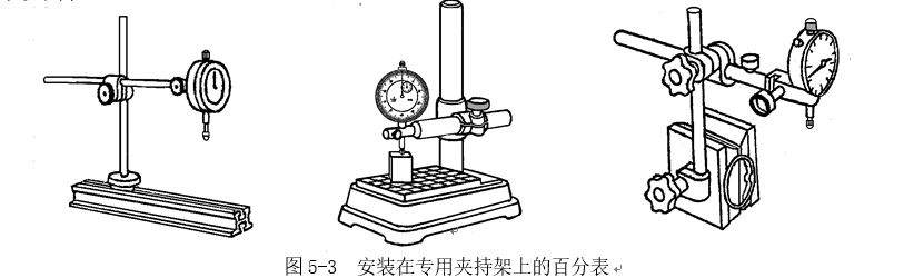 2  使用百分表或千分表時(shí),必須把它固定在可靠的夾持架上(如固定在萬能表架或磁性表座上,圖5-3所示),夾持架要安放平穩(wěn),免使測(cè)量結(jié)果不準(zhǔn)確或摔壞百分表。
