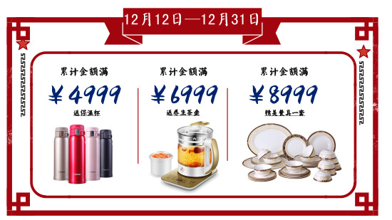 第二重:累計(jì)滿送好禮,多滿多送,活動時(shí)間:12月12日至12月31日。