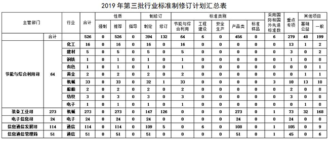 2019年第三批標(biāo)準(zhǔn)修制訂計(jì)劃共安排項(xiàng)目計(jì)劃526項(xiàng),其中制定394項(xiàng)、修訂132項(xiàng);重點(diǎn)專項(xiàng)標(biāo)準(zhǔn)279項(xiàng)、基礎(chǔ)公益類標(biāo)準(zhǔn)48項(xiàng)、一般標(biāo)準(zhǔn)199項(xiàng);產(chǎn)品類標(biāo)準(zhǔn)456項(xiàng)、工程建設(shè)標(biāo)準(zhǔn)6項(xiàng)、節(jié)能與綜合利用標(biāo)準(zhǔn)64項(xiàng)。這526項(xiàng)標(biāo)準(zhǔn)皆為推薦性質(zhì),涉及了化工、建材、鋼鐵、有色、黃金、機(jī)械、船舶、紡織、電子、通信等行業(yè)。無疑,這批標(biāo)準(zhǔn)的修制訂將是對標(biāo)準(zhǔn)化體系的進(jìn)一步完善,能有效促進(jìn)我國標(biāo)準(zhǔn)化水平的提升,同時(shí)也將推動行業(yè)的高質(zhì)量發(fā)展和創(chuàng)新發(fā)展。