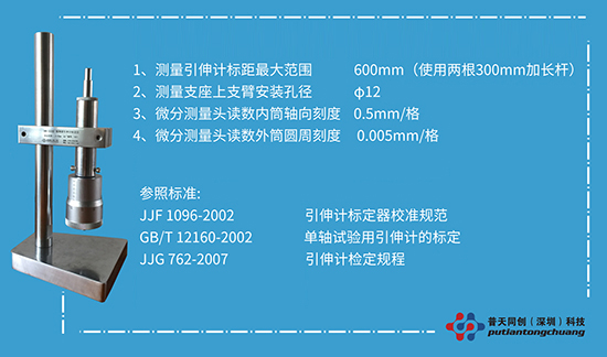 本儀器由精密微分測量頭、底座支架和加長桿等組成。可以方便地進行多種規格型號引伸計的計量標定。精密微分測量頭由滑動量桿、量桿套筒、讀數內筒、讀數外筒及高精密螺紋付組成。其最大量程25mm;最小分度(游標分度) 0.001mm。