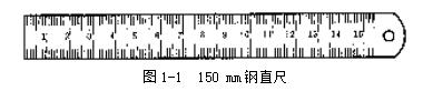 鋼直尺是最簡單的長度量具,它的長度有150,300,500和1000 mm四種規格。圖1-1是常用的150 mm鋼直尺。