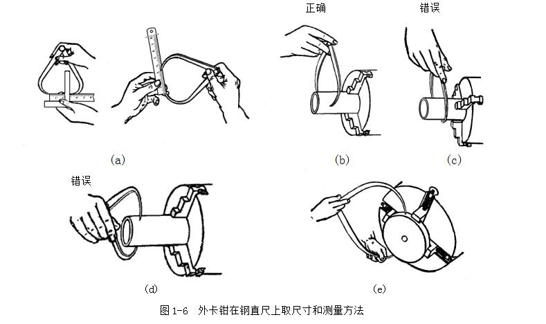 外卡鉗在鋼直尺上取下尺寸時,如圖1-6(a),一個鉗腳的測量面靠在鋼直尺的端面上,另一個鉗腳的測量面對準(zhǔn)所需尺寸刻線的中間,且兩個測量面的聯(lián)線應(yīng)與鋼直尺平行,人的視線要垂直于鋼直尺。
