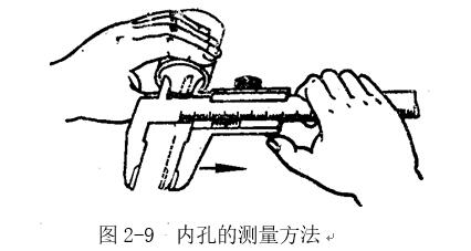4 當(dāng)測量零件的內(nèi)尺寸時(shí):圖2-9所示。要使量爪分開的距離小于所測內(nèi)尺寸,進(jìn)入零件內(nèi)孔后,再慢慢張開并輕輕接觸零件內(nèi)表面,用固定螺釘固定尺框后,輕輕取出卡尺來讀數(shù)。取出量爪時(shí),用力要均勻,并使卡尺沿著孔的中心線方向滑出,不可歪斜,免使量爪扭傷;變形和受到不必要的磨損,同時(shí)會(huì)使尺框走動(dòng),影響測量精度。