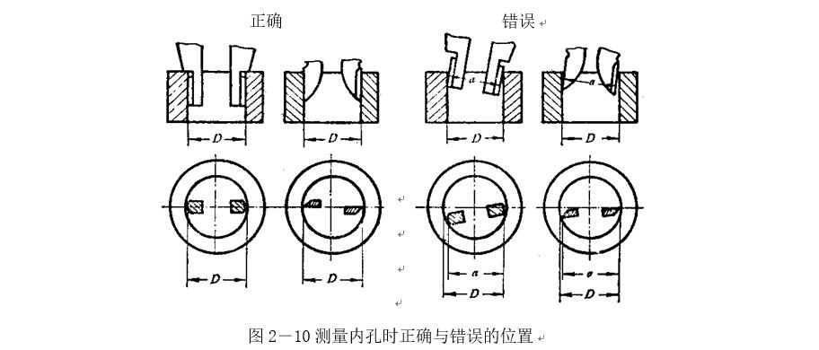 卡尺兩測量刃應(yīng)在孔的直徑上,不能偏歪。圖2-10為帶有刀口形量爪和帶有圓柱面形量爪的游標(biāo)卡尺,在測量內(nèi)孔時(shí)正確的和錯(cuò)誤的位置。當(dāng)量爪在錯(cuò)誤位置時(shí),其測量結(jié)果,將比實(shí)際孔徑D要小。
