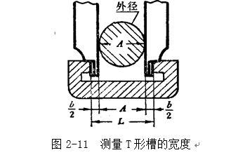 用游標(biāo)卡尺測量T形槽的寬度,如圖2-11所示。測量時將量爪外緣端面的小平面,貼在零件凹槽的平面上,用固定螺釘把微動裝置固定,轉(zhuǎn)動調(diào)節(jié)螺母,使量爪的外測量面輕輕地與T形槽表面接觸,并放正兩量爪的位置 (可以輕輕地擺動一個量爪,找到槽寬的垂直位置),讀出游標(biāo)卡尺的讀數(shù)圖2-11中用A表示。但由于它是用量爪的外測量面測量內(nèi)尺寸的,卡尺上所讀出的讀數(shù)A是量爪內(nèi)測量面之間的距離,因此必須加上兩個量爪的厚度b,才是T形槽的寬度。所以,T形槽的寬度L=A+b